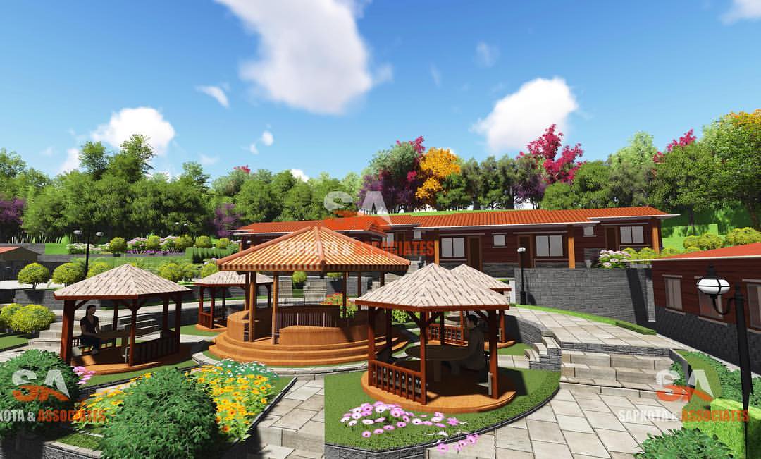The Eco Village Resort embodies the essence of sustainable design techniques native to the region, showcasing a harmonious integration with its surroundings. Utilizing locally sourced materials such as timber, bamboo, and stone in construction, the resort pays homage to traditional Nepalese architecture, seamlessly blending into its environment. Thoughtful planning ensures the resort merges effortlessly with the natural contours of the site, with cottages strategically positioned to capture panoramic views, accessed by intricately carved stone steps. Meanwhile, the restaurant, outdoor dining spaces, and tranquil ponds are situated on flat terrain, enhancing guest experiences amidst lush, locally curated flora that complements the resort’s design aesthetic.